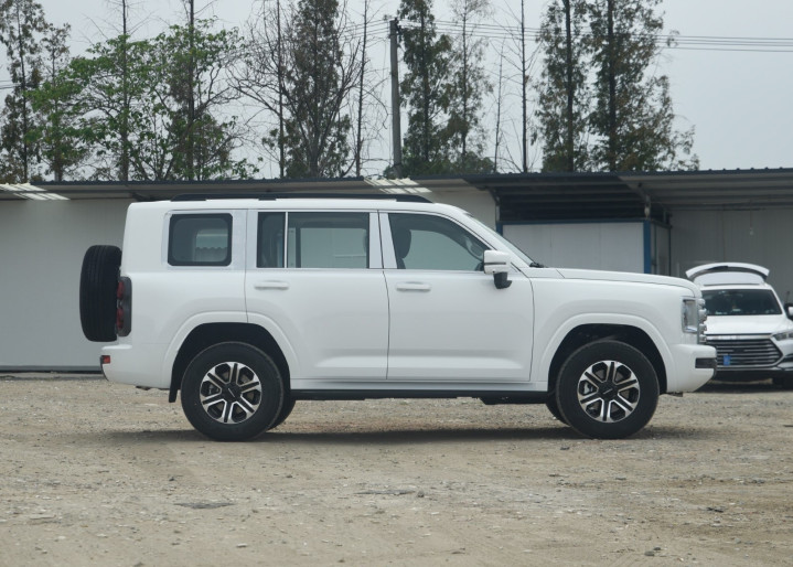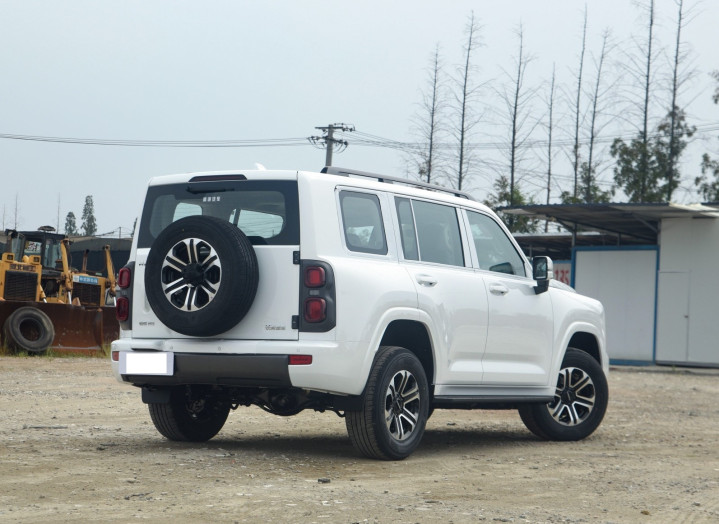 再来看车尾部分,方正的尾门为垂直式的造型,而侧开式尾门配备背负式全尺寸备胎(可选储物箱),分体式竖置尾灯组集成高位刹车灯,熏黑饰板包裹刹车灯,整体立体感十足。后保险杠集成拖车钩与电源接口。离去角达23°,配合后桥差速锁实现复杂地形脱困。