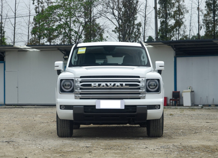 我们首先来看新车的外观设计方面,新车的前脸采用粗壮镀铬格栅镶嵌,大尺寸的字母镶嵌提升品牌辨识度,两侧搭配圆形LED大灯,看起来硬朗而霸气,而黑武士版本对格栅、灯框及保险杠进行熏黑处理,强化视觉冲击力。突出的前保险杠内嵌雾灯组,接近角达29°,配合800mm涉水喉预留位,彰显硬核越野基因。熔岩红配色版本则通过红色饰条点缀,增添运动气息。